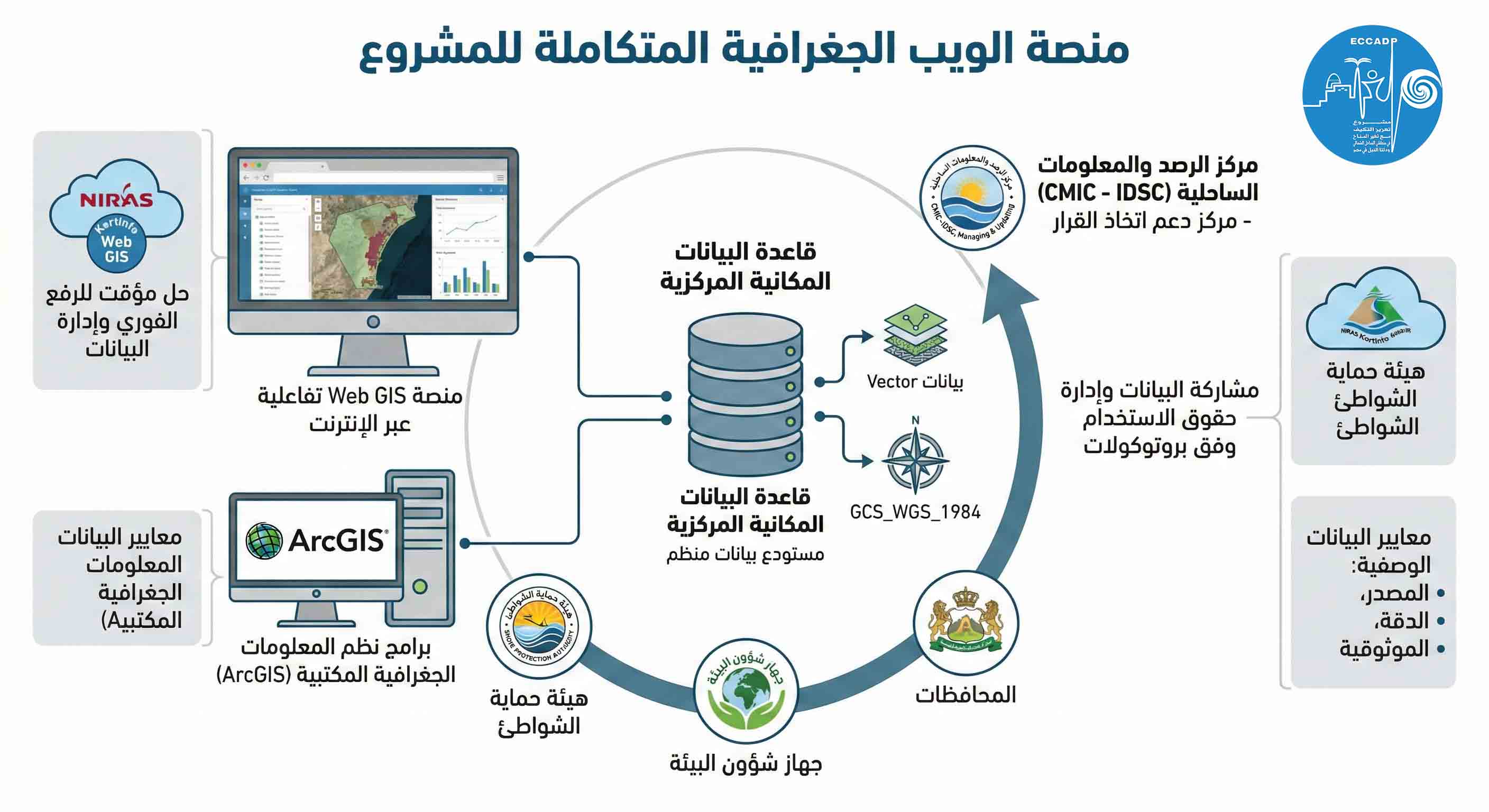 وخلال مرحلة البداية، تم تطبيق حل مؤقت يعتمد على NIRAS KortInfo Web GIS لضمان الرفع الفوري للبيانات وإدارتها وإتاحتها لجميع أطراف المشروع. ويجري تطوير قاعدة بيانات جغرافية شاملة تضم الخصائص الطبيعية والفيزيائية والاجتماعية-الاقتصادية لمنطقة الدراسة، وتدعم بيانات (Vector & Raster) ، مع الالتزام بمعايير دقيقة للبيانات الوصفية تشمل المصدر، والدقة، والموثوقية، ونظم الإسقاط، باستخدام نظام الإحداثيات GCS_WGS_1984 وتعمل قاعدة بيانات الـ GIS كمستودع مركزي منظم للبيانات، على أن يتولى مركز الرصد والمعلومات الساحلية (CMIC) - الجارى انشاءه مع مركز دعم اتخاذ القرار بمجلس الوزراء ، جمعها وتحديثها بشكل مستمر، لضمان استدامة إتاحتها ودعم التخطيط المستقبلي ومعالجة تشتت البيانات بين الجهات.