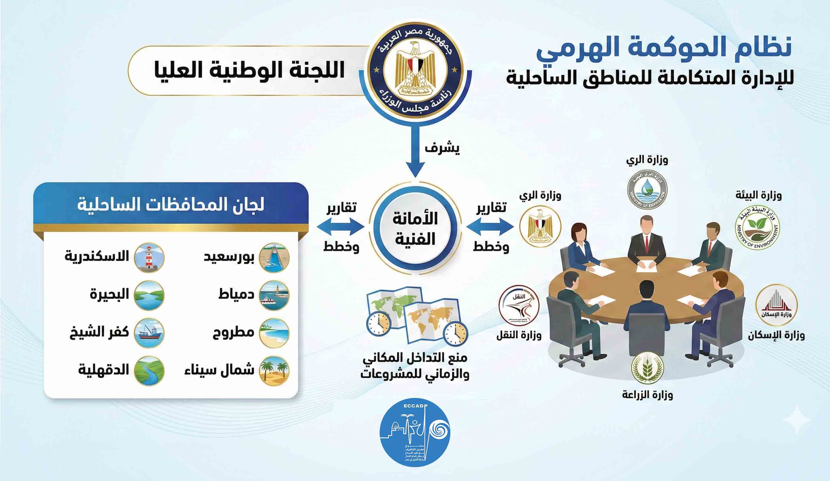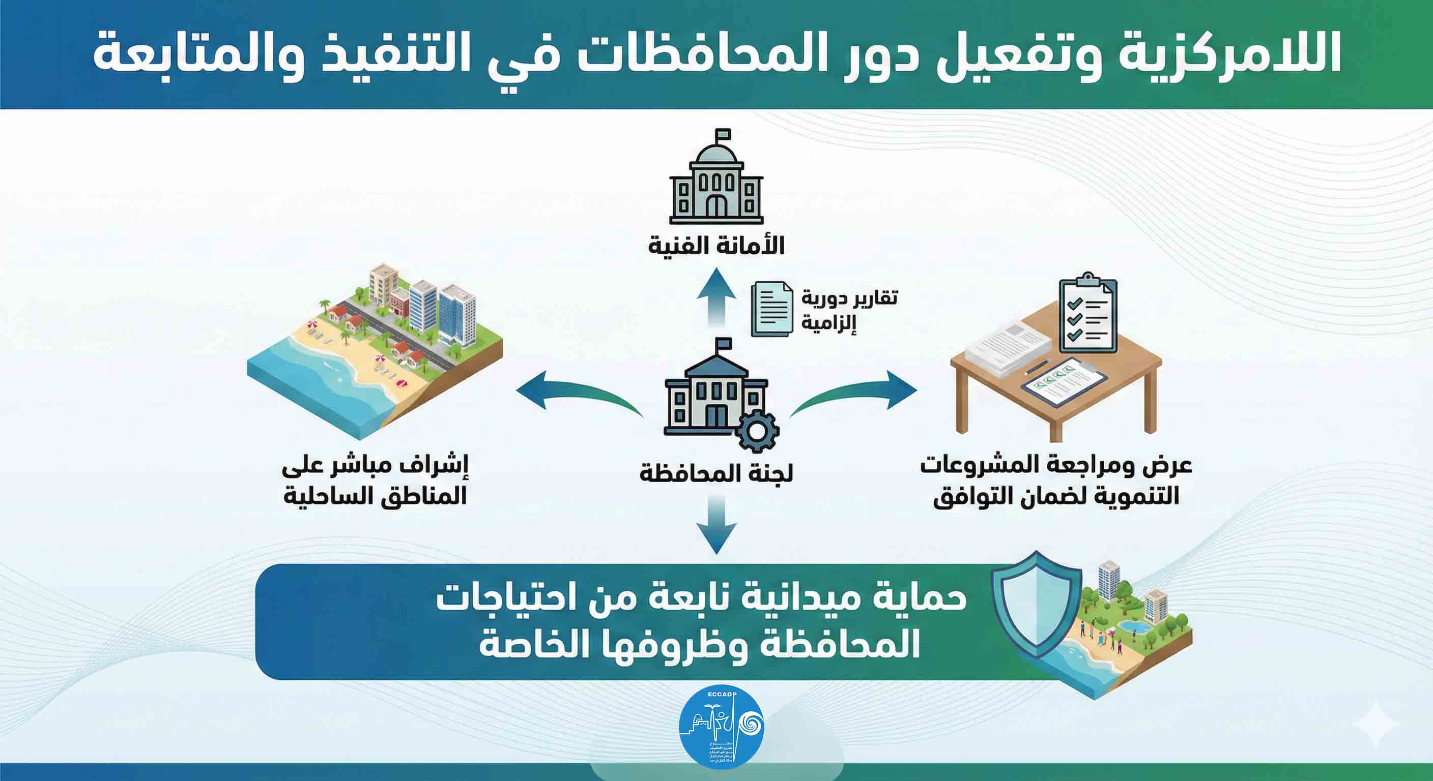 اللامركزية وتفعيل دور المحافظات في التخطيط التنفيذ والمتابعة: يمنح الإطار صلاحيات واسعة لـ "لجان المحافظات" للإشراف المباشر على المناطق الساحلية التابعة لها. وتتولى هذه اللجان مسؤولية عرض المشروعات التنموية ومراجعتها لضمان توافقها مع خطة الإدارة المتكاملة، مع إلزامية تقديم تقارير دورية للأمانة .الفنية، مما يضمن أن تكون الحماية الميدانية للسواحل نابعة من احتياجات كل محافظة ووفقاً لظروفها الجغرافية الخاصة
