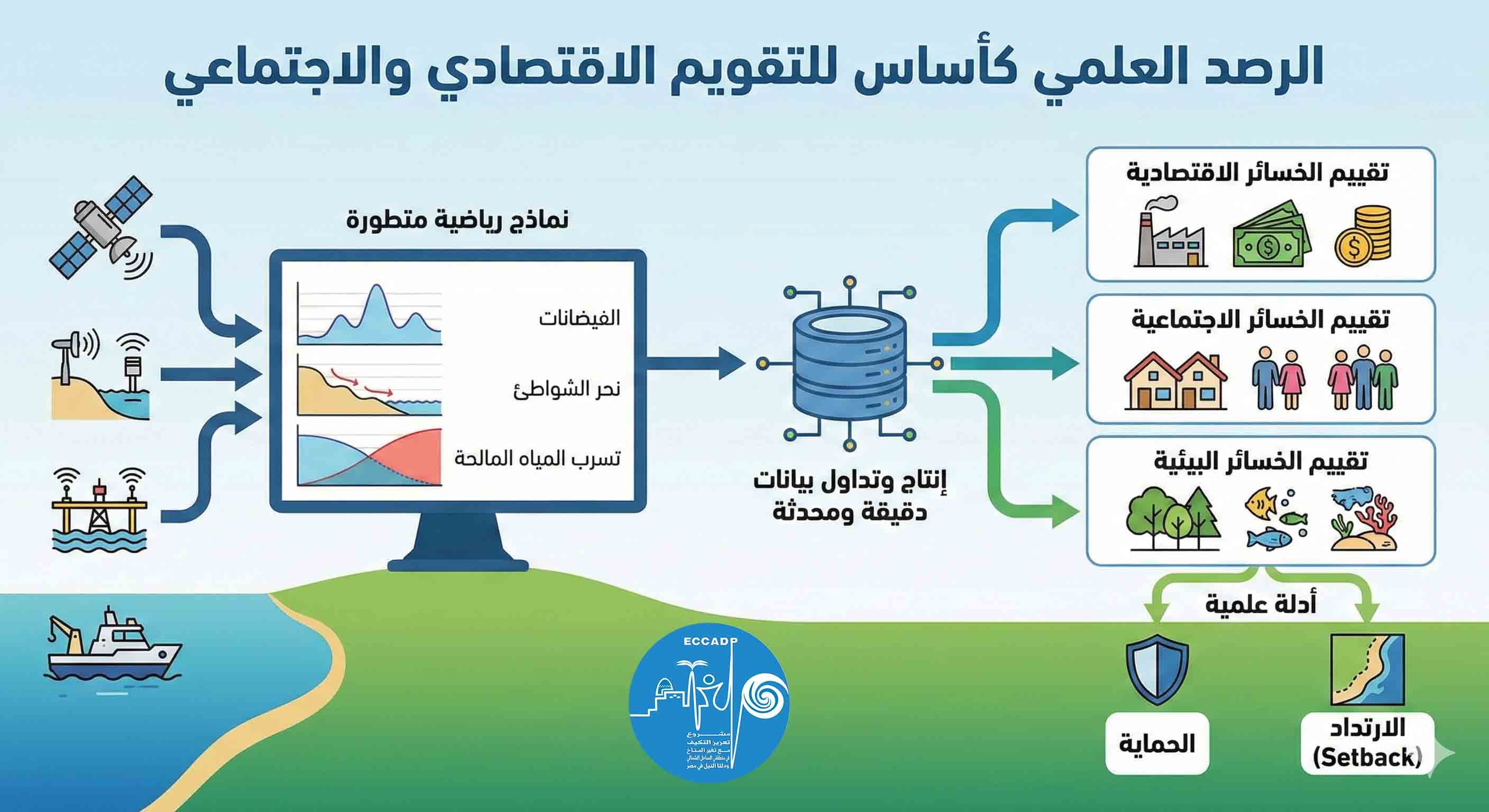 الرصد العلمي كأساس للتقويم الاقتصادي والاجتماعي: لا يقتصر الإطار على الجانب الإداري، بل يرتكز على إنتاج وتداول بيانات دقيقة ومحدثة. يتم استخدام نماذج رياضية متطورة لرصد (الفيضانات، نحر الشواطئ، وتسرب المياه المالحة)، وهو ما يسمح بإعداد تقييم دقيق للخسائر الاقتصادية والاجتماعية والبيئية المحتملة، وتحديد أولويات الحماية أو "الارتداد.." (Setback) بناءً على أدلة علمية لا تقبل التأويل.