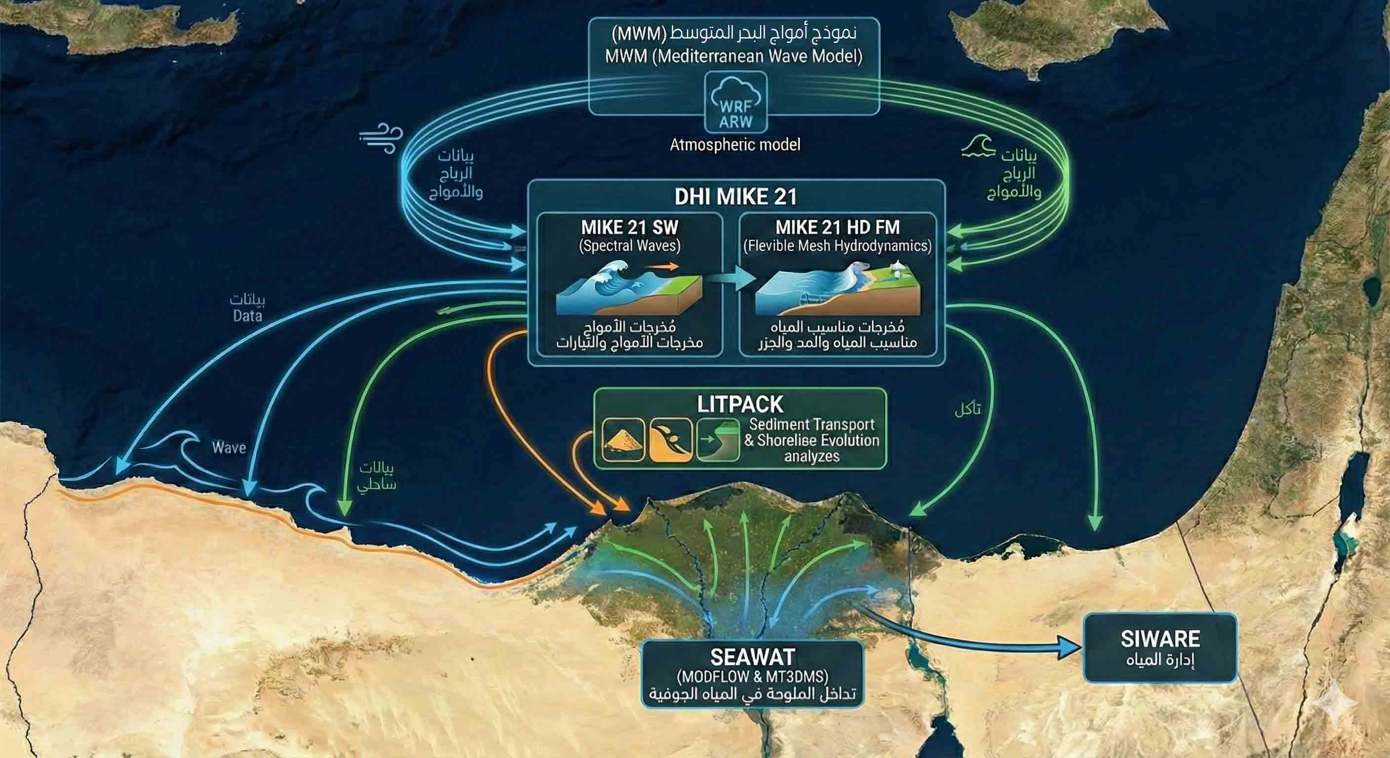 وتدعم هذه النماذج منظومة نموذج الرياح والأمواج للبحر المتوسط (MWM)، والتي تعتمد على النموذج الجوي WRF ARW لتوفير شروط حدودية عالية الدقة للرياح والأمواج. أما فيما يخص التحليل المورفولوجي، فيُستخدم نظام LITPACK لحساب نقل الرواسب والتنبؤ بتطور خط الساحل.