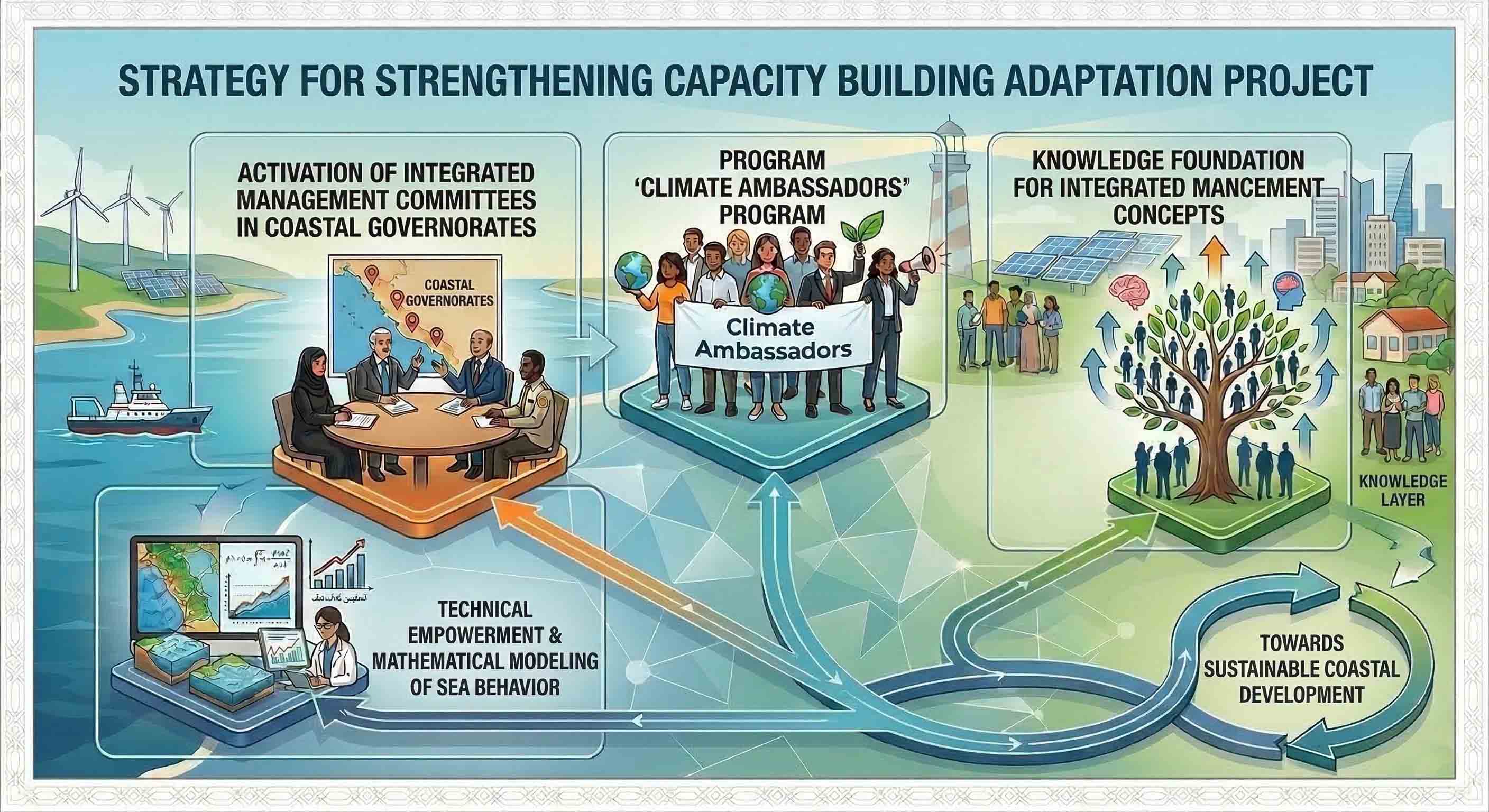 The "Climate Ambassadors" program represents the heart and core pillar of the Integrated Management Plan. It is dedicated to building and qualifying national cadres, professionally trained to navigate the complexities and repercussions of climate change. The program's role transcends technical knowledge to include strategic investment in the employee's personal attributes and leadership skills, aiming to hone capabilities in effective communication, negotiation, and crisis management. This approach seeks to transform employees into proactive agents of change who champion climate awareness within their institutions, ensuring the preparation of a "Climate Ambassador" who possesses both technical literacy and personal resilience to serve as a professional bridge between scientific data and the coastal decision-making process.