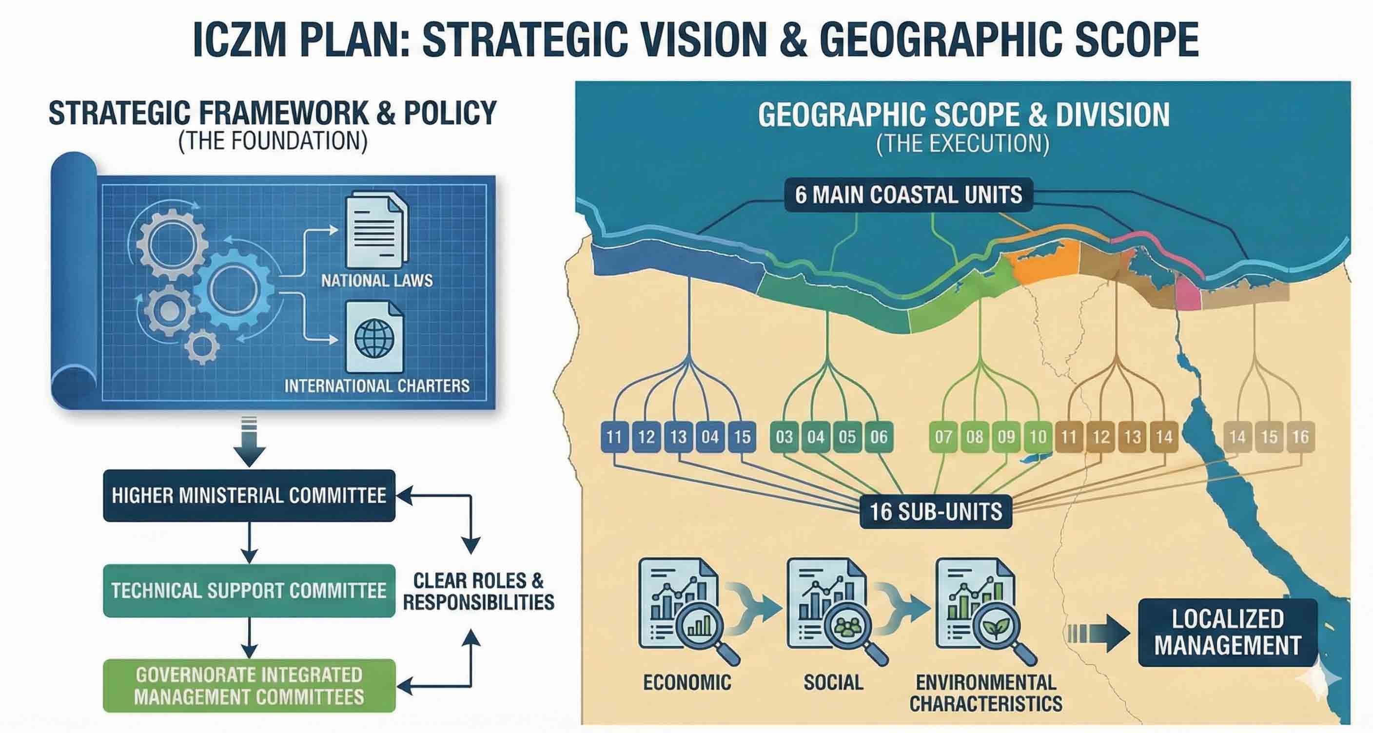 Strategic Vision and Geographic Scoping: The Integrated Coastal Zone Management (ICZM) plan establishes the foundation through a public policy framework that defines standards and strategic objectives in alignment with local laws and international conventions. This pathway involves delineating the institutional framework and precisely allocating roles among the High National Committee, Technical Secretariats, and Governorate Committees. To ensure implementation accuracy, the coastline has been geographically divided into 6 main coastal units, branching into 16 sub-units. Each unit has undergone a detailed assessment of its economic, social, and environmental characteristics to ensure localized management that is well-attuned to the specific nature of each region.