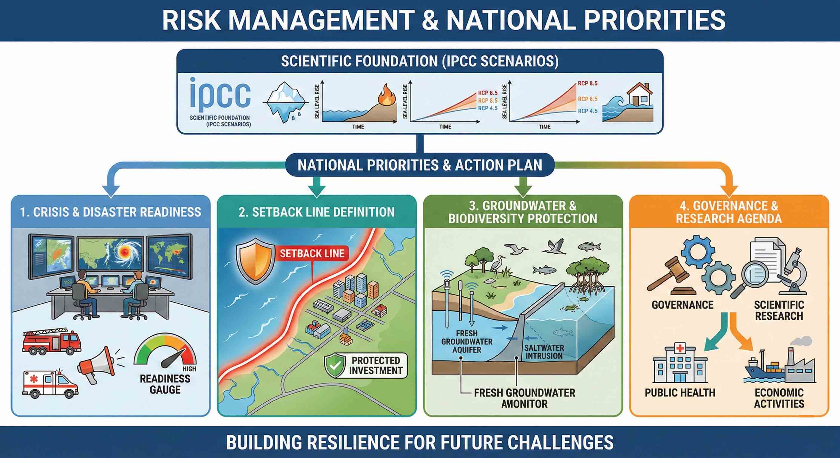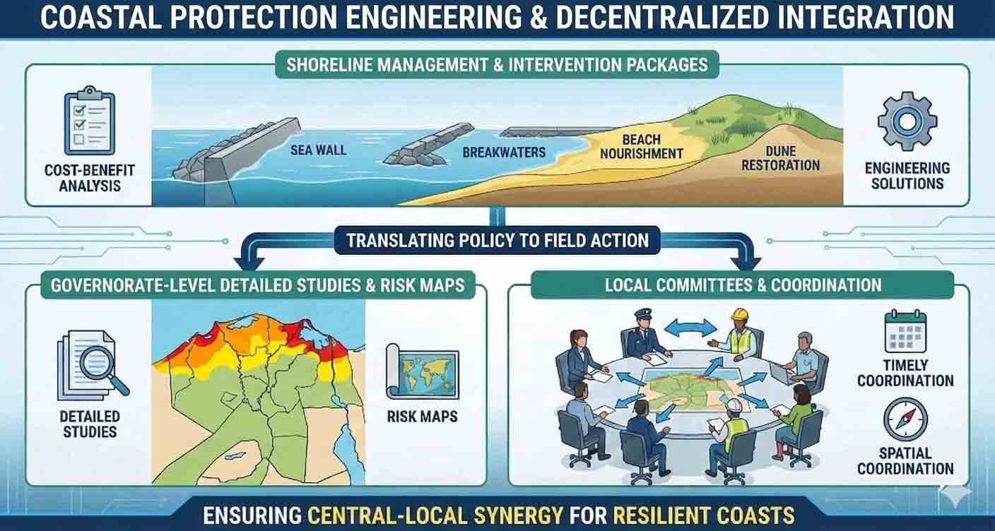 Shore Protection Engineering and Decentralized Integration with Governorates: The plan transitions from policy-making to field implementation mechanisms through the Shoreline Management Plan (SMP). This plan examines the topographical nature of each coastal unit and proposes a package of interventions and protection works prioritized based on a "Cost-Benefit Analysis" (CBA). This technical effort is translated into detailed studies and risk maps for each individual governorate, assisting governorate committees in developing their local plans and ensuring their spatial and temporal coordination among various directorates. This approach ensures the seamless integration of efforts between the central and local levels.
