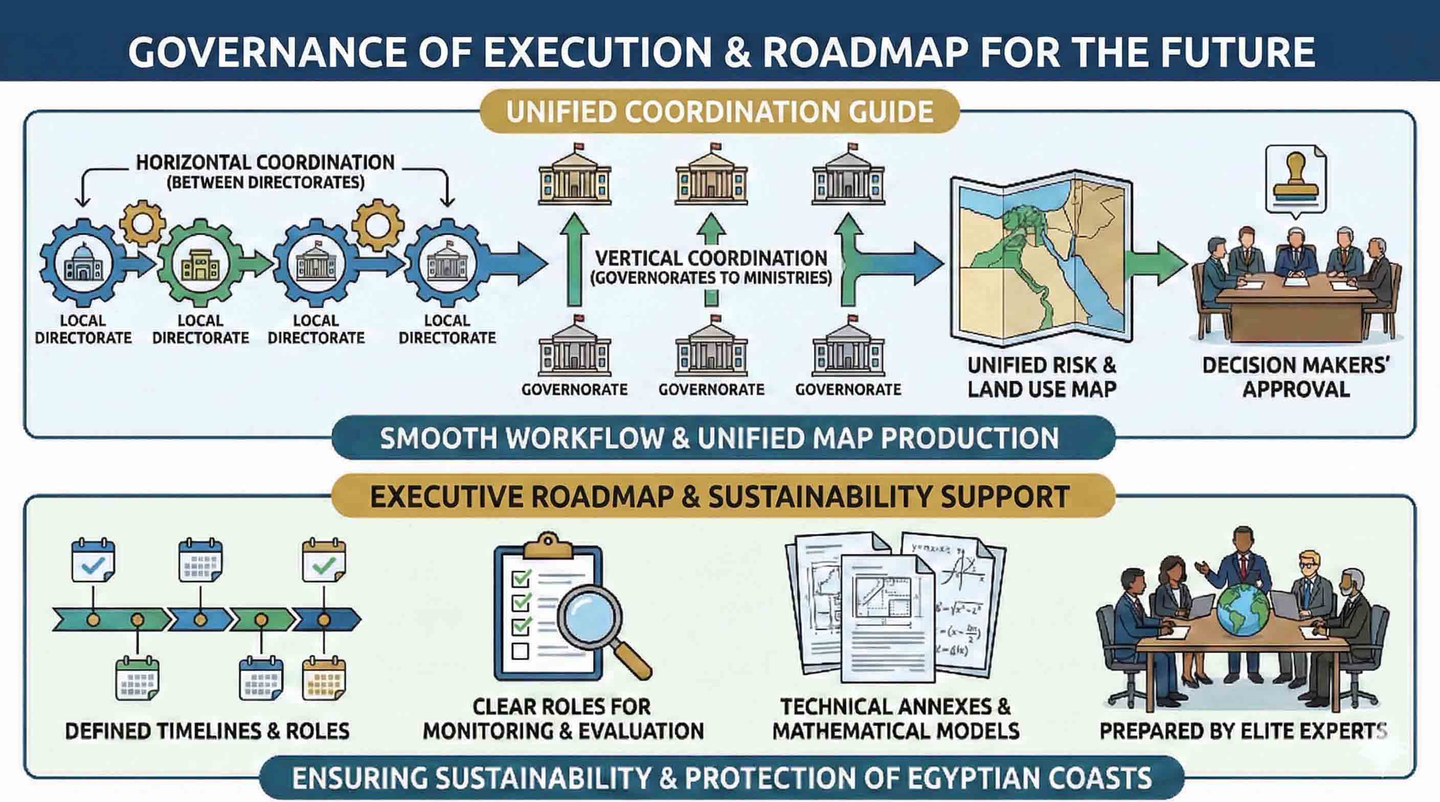 Implementation Governance and the Roadmap for the Future:To ensure a seamless workflow, the plan provides operational guidelines outlining the steps for horizontal coordination (among directorates) and vertical coordination (between governorates and ministries). This process culminates in the production of a unified Risk and Land Use Map, to be submitted to decision-makers for official approval. The system is finalized with an executive roadmap that includes specific timelines and clear roles for Monitoring and Evaluation (M&E). This framework is further supported by technical annexes and mathematical models developed by an elite group of international and national experts to ensure the sustainability and protection of Egypt's coastlines.